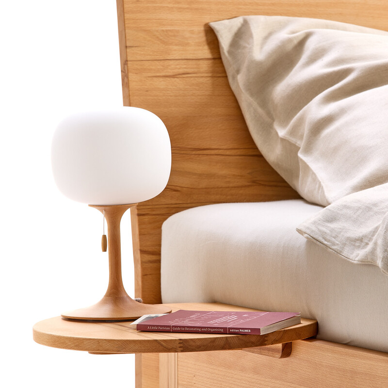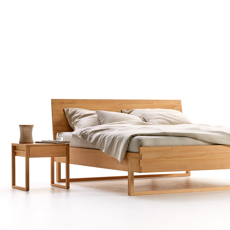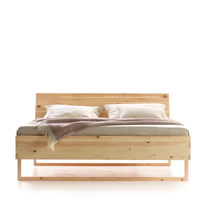 Vor allem in Zirbe ausgeführt, verlangt Akato aufgrund der lebendigen Maserung dieser Holzart nach einfachen, klaren Formen. Die beiden kufenartigen Fußgestelle sind etwas nach innen versetzt und geben dem Bett eine optisch leichte, beinahe schwebende Anmutung. Seitlich hochgezogen, wandeln sich diese Kufen zu sichtbaren Gestaltungselementen, die den robusten Bettrahmen optisch gliedern.