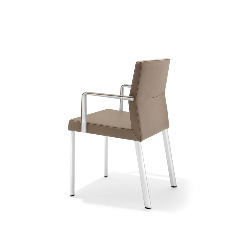 Markant die Linienführung der Rückenlehne mit Ziernaht am Rücken. Ein Stuhl, der seinen Charme aus der gekonnten Kombination von Aluminium und Leder/Stoff bezieht.