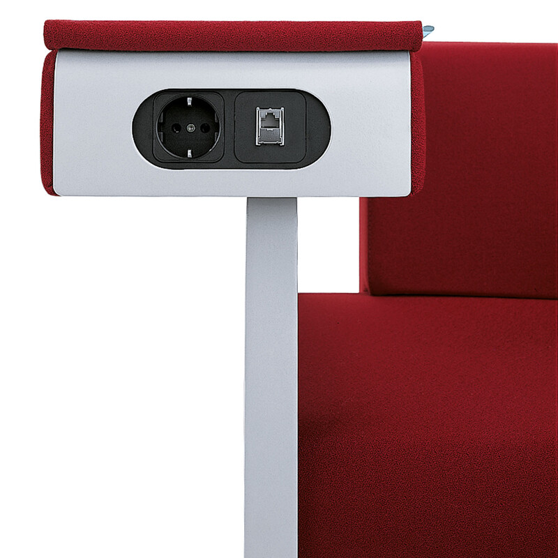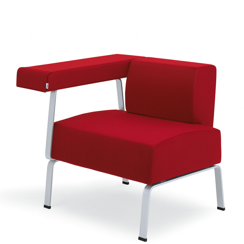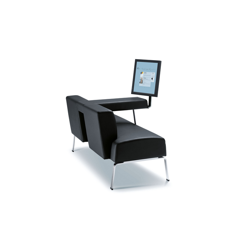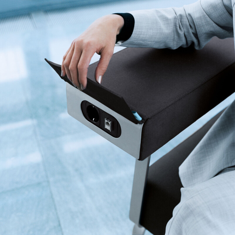 Coffice, konzipiert für alle Bereiche, in denen man in entspannter Atmosphäre warten, kommunizieren oder arbeiten möchte. Die breite Armlehne (optional mit Plugbox für Strom und Netz) fungiert als Arbeitsfläche und bietet Platz für Schreibunterlagen, Laptop oder eine Tasse Kaffee.