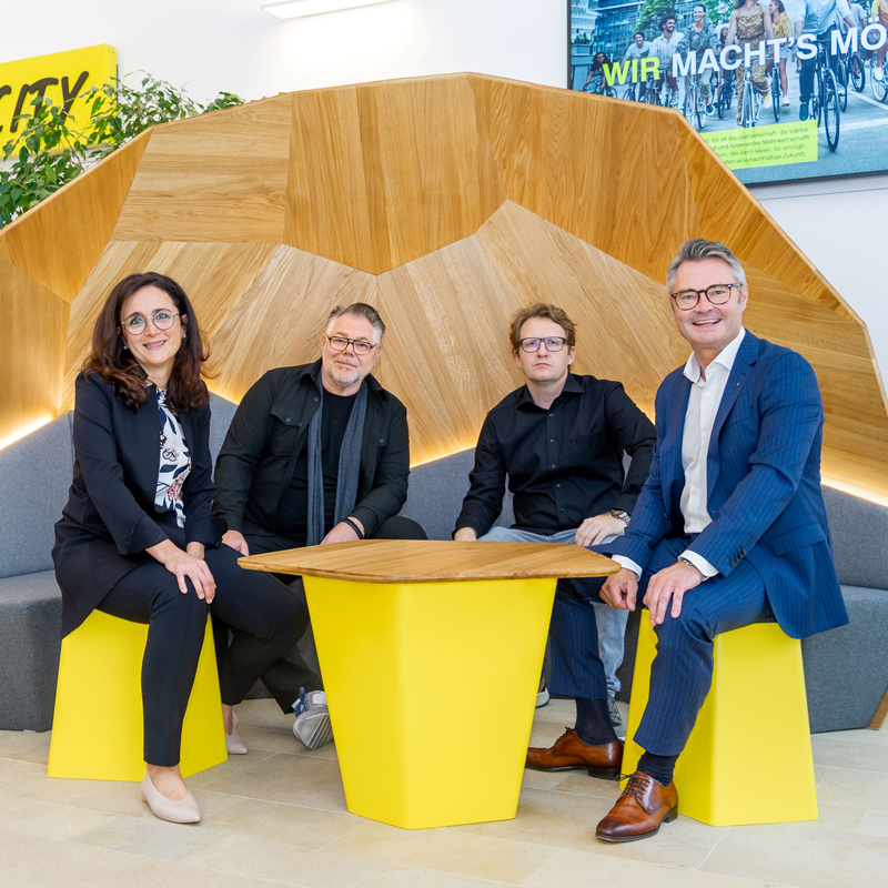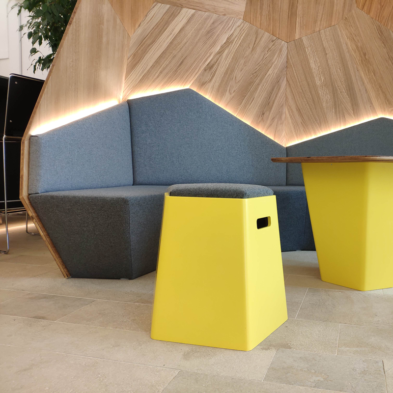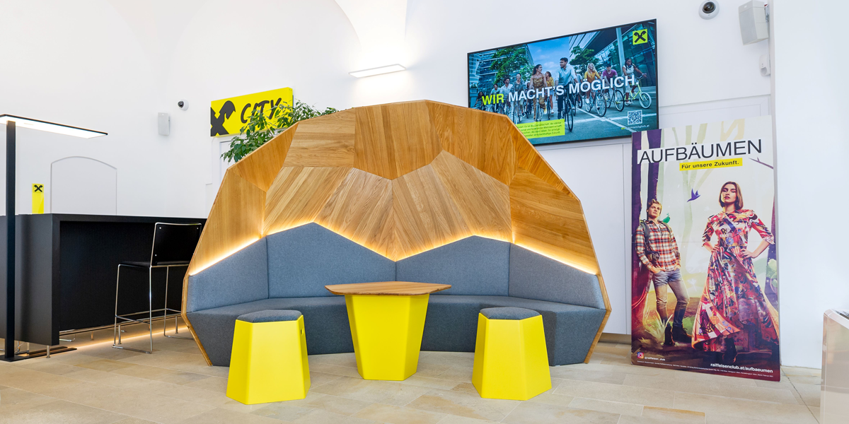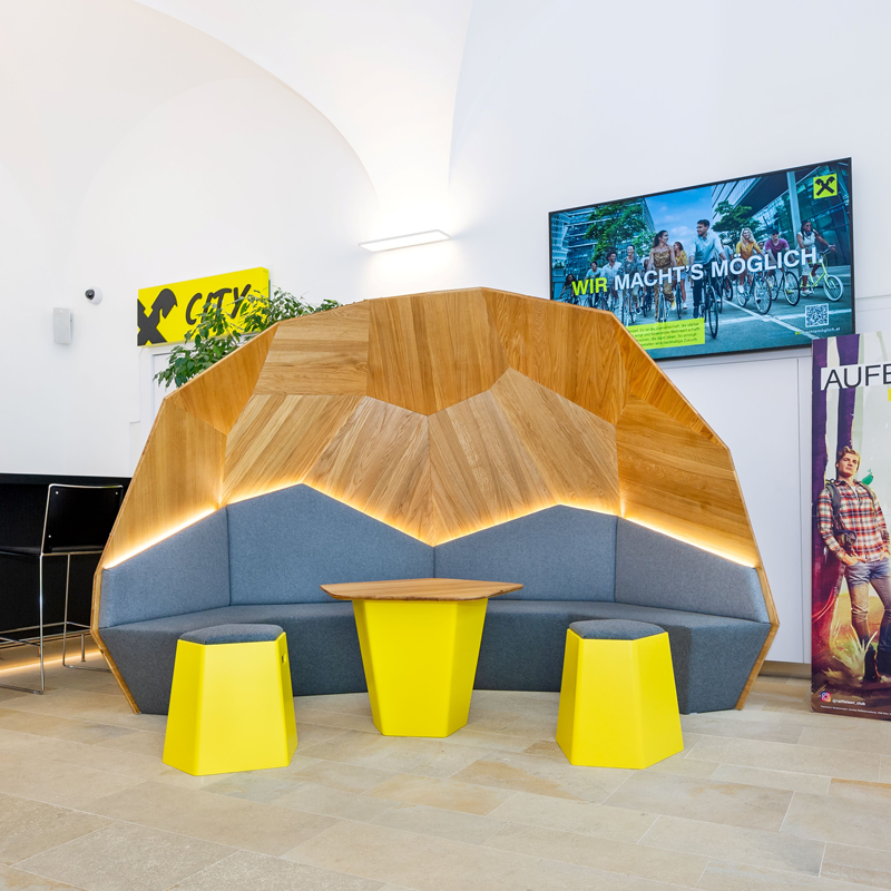 Das zentrale Element von ‚Landscape' ist die vertikale, schalenförmige Holzstruktur, die mit ihrer fraktalen Form an die sanfte, hügelige Landschaft der Ost- oder Südsteiermark erinnert und einen geschützten Bereich für die Kommunikation schafft. Die Sitzbank integriert sich perfekt in die Abschirmung, nur ein Lichtakzent trennt sie optisch davon ab. Hocker und Tisch sind in der CI-Farbe von Raiffeisen gehalten und können auch gestapelt als Stehtisch genutzt werden. Bei der Umsetzung wurde selbstverständlich auch auf Regionalität geachtet: Massive österreichische Eiche und Loden der Firma Steiner wurden von der Tischlerei Schaden verarbeitet.