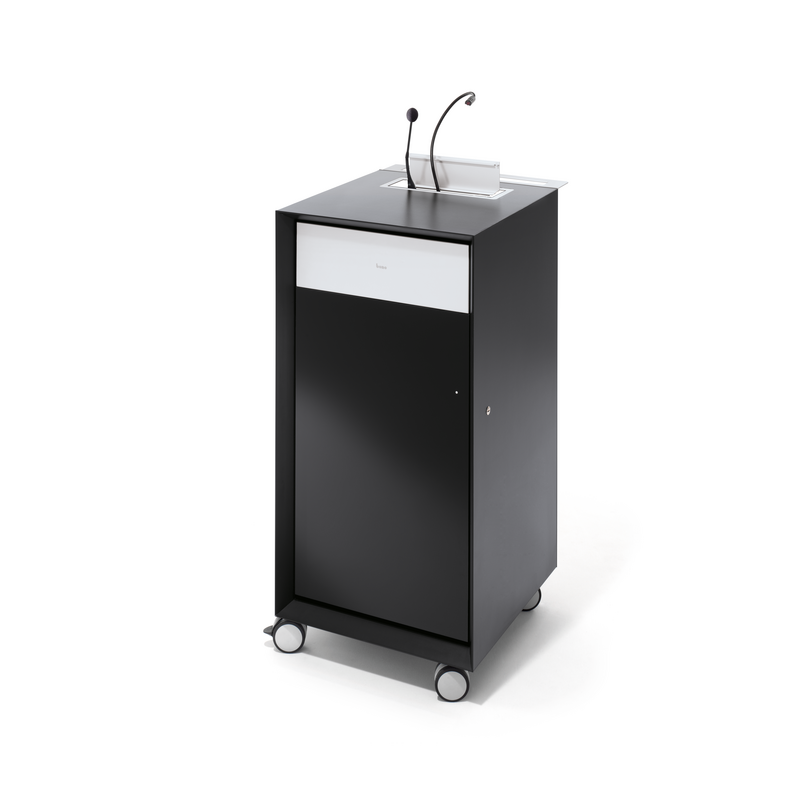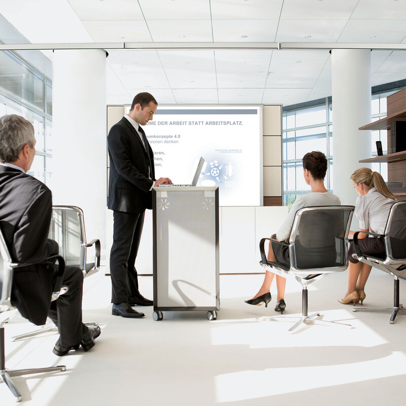 Ein komplett ausgestattetes Medienmöbel für Information, Präsentation und Kommunikation. Mit integriertem Projektor, Lautsprechern, AV-Steuerzentrale, Mikrofon und Touch-Screen-Fernbedienung bringt der Media Caddy innovative Medienvielfalt in jeden Raum.