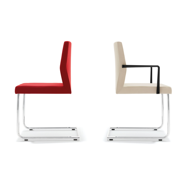 Ein Stuhl mit klassischer Identität. Souverän durch klares Design und formale Ausgewogenheit. Signifikant die elegante und dynamische Linienführung. Ein Stuhl mit bestem Sitzkomfort. Mit leicht konisch geformtem Sitzpolster und prägnanter Rückenlehne.