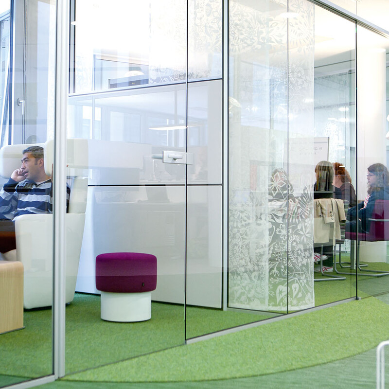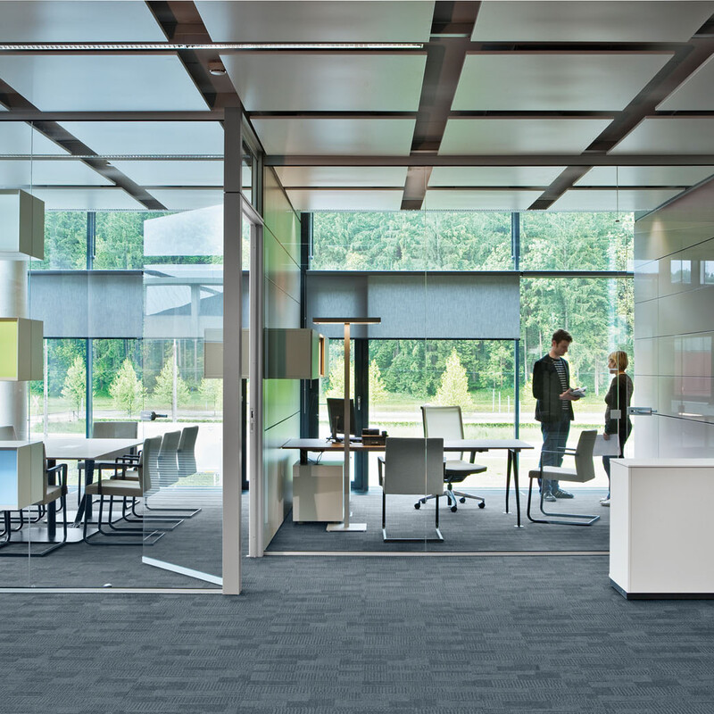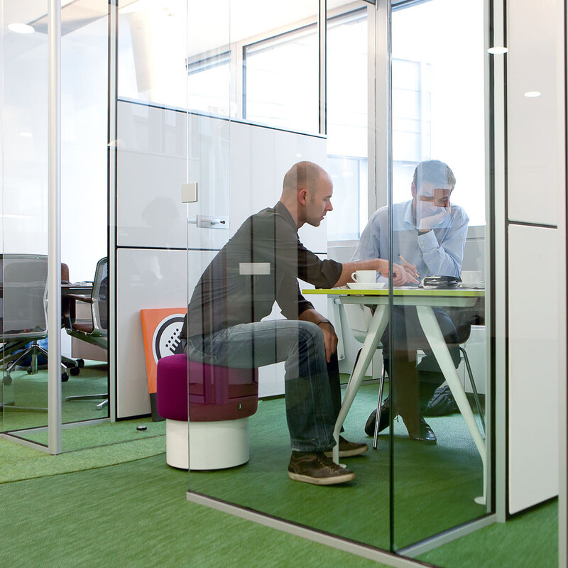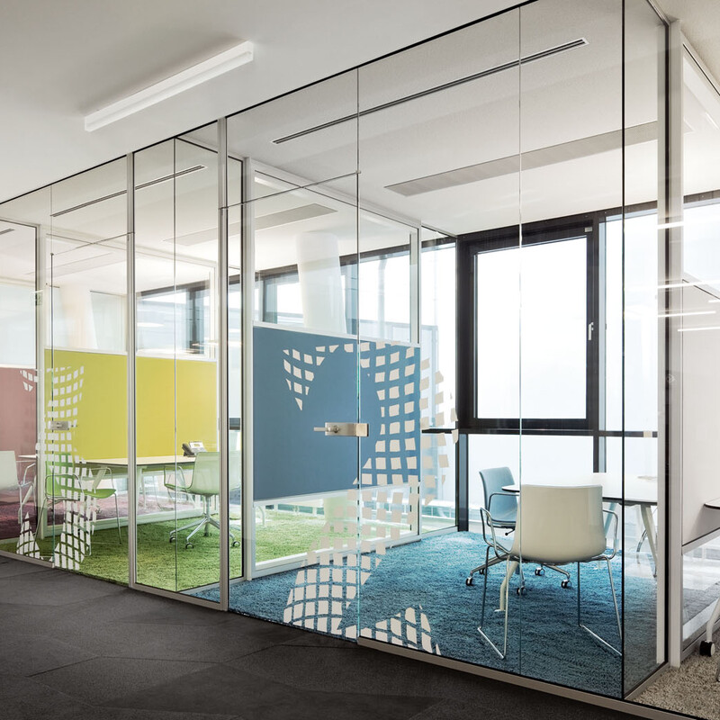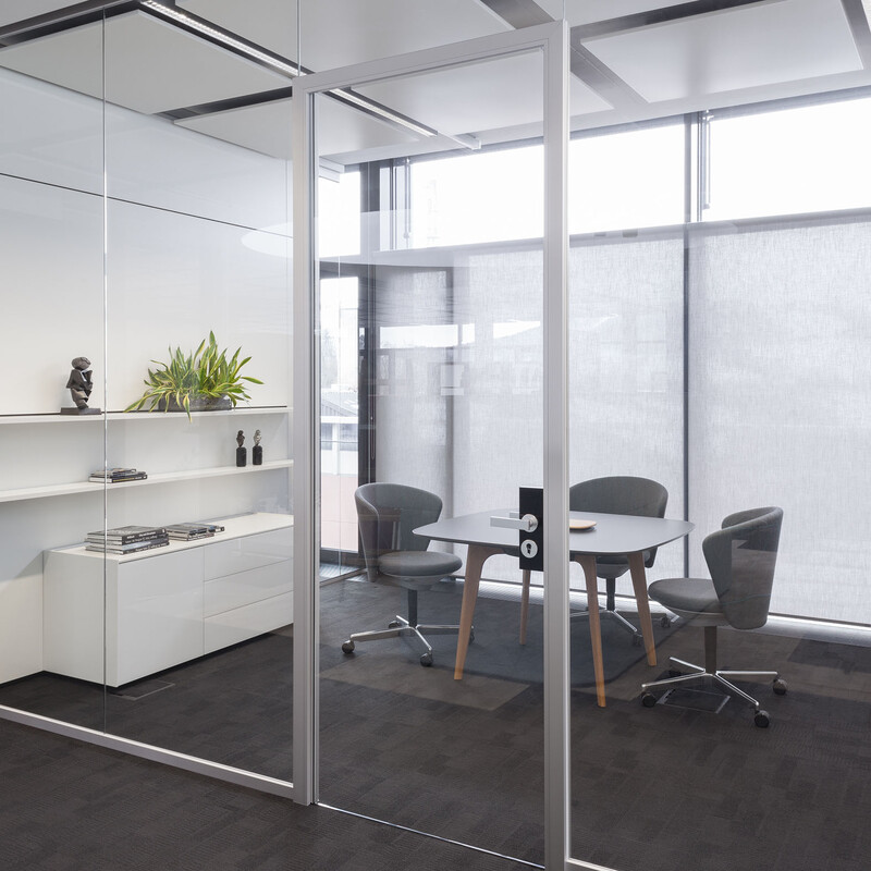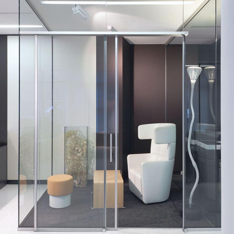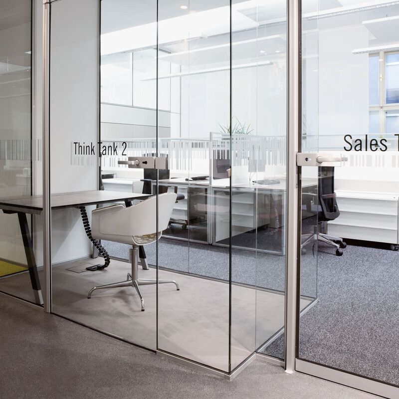 Die RG Ganzglaswand verfügt über Dreh- und Schiebetüren, wahlweise ein- oder zweiflügelig. Dreh- und Schiebetüren kommen ohne Zargenkonstruktion aus und nutzen die statische Tragfähigkeit der Glaselemente. Das modulare System ermöglicht Flexibilität und Reversibilität. Die RG Ganzglaswand fungiert als Mittler zwischen starren architektonischen Rahmenbedingungen und flexiblen Innenausbausystemen.
