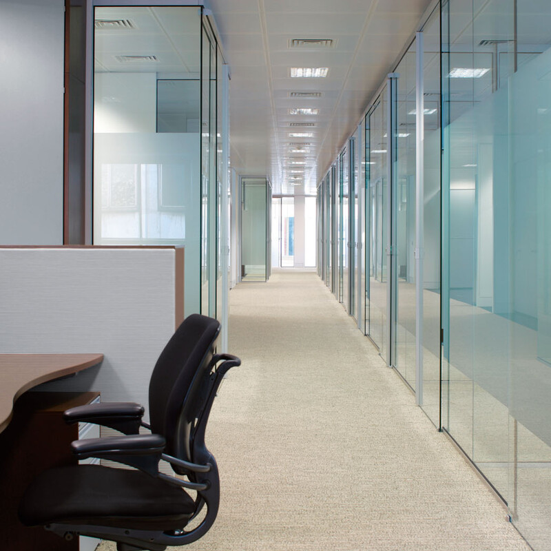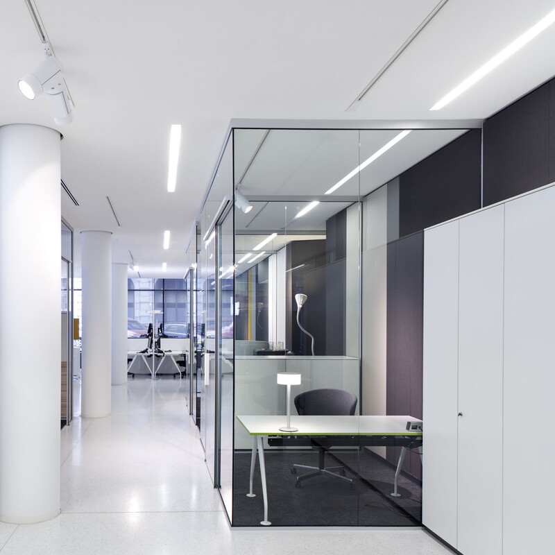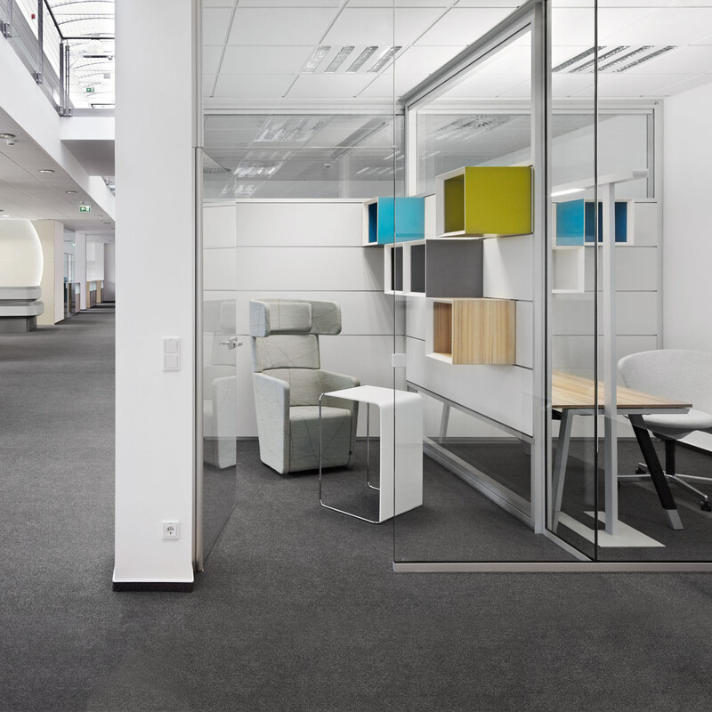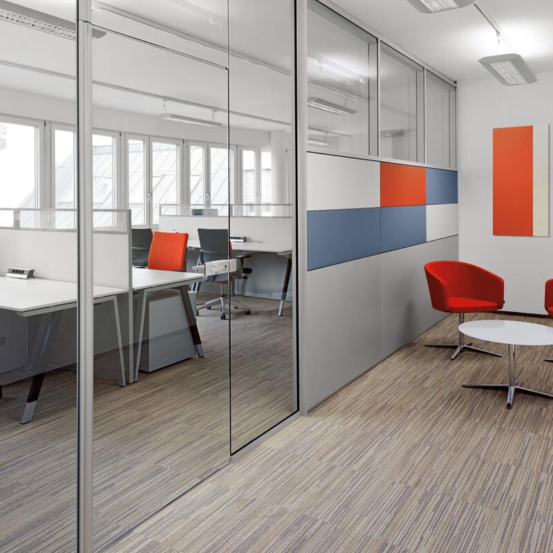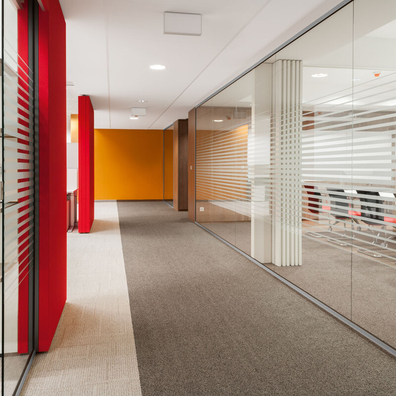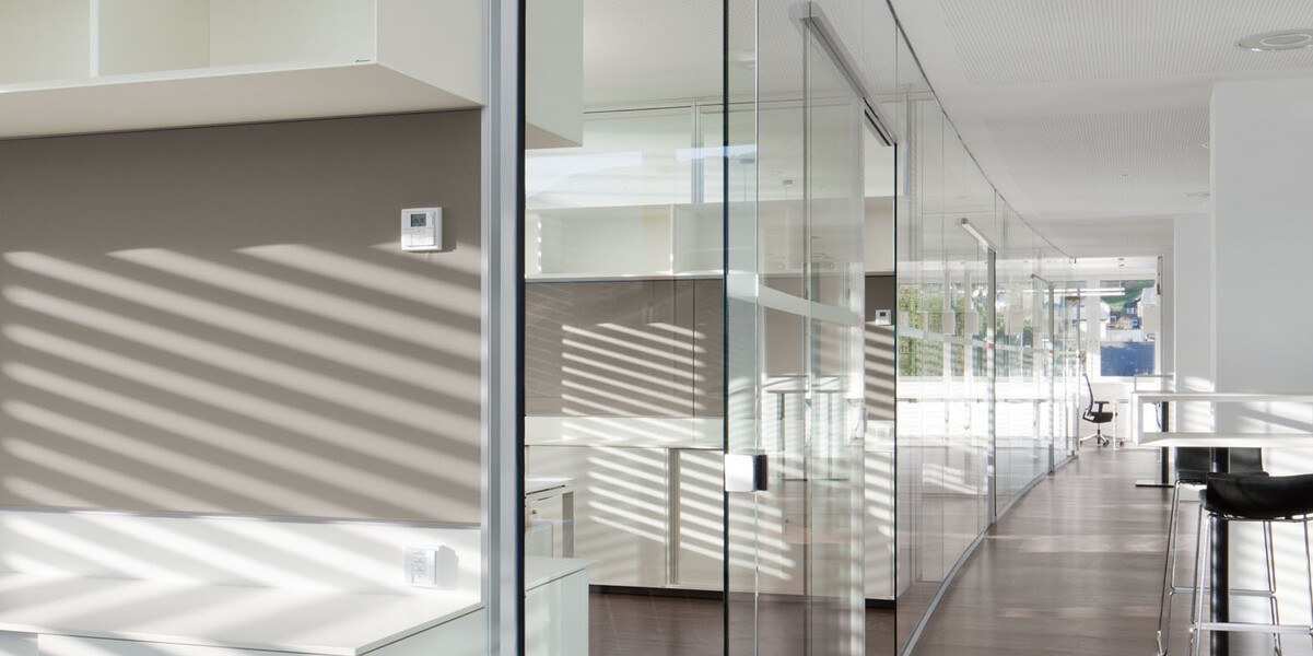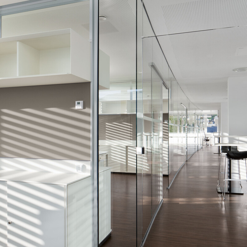 Die RG Flurwand ist als Ganzglaswand konzipiert. Formal reduziert, nimmt sich die RG zurück und unterstützt die Architektur des Raumes. Sie besteht aus minimierten, horizontalen Profilen an Decke und Boden sowie Glasscheiben, die durch eingepresste Dichtungen gehalten werden. Das Wandsystem kann entsprechend den statischen und akustischen Anforderung ein- oder zweischalig mit unterschiedlichen Glasstärken ausgeführt werden.