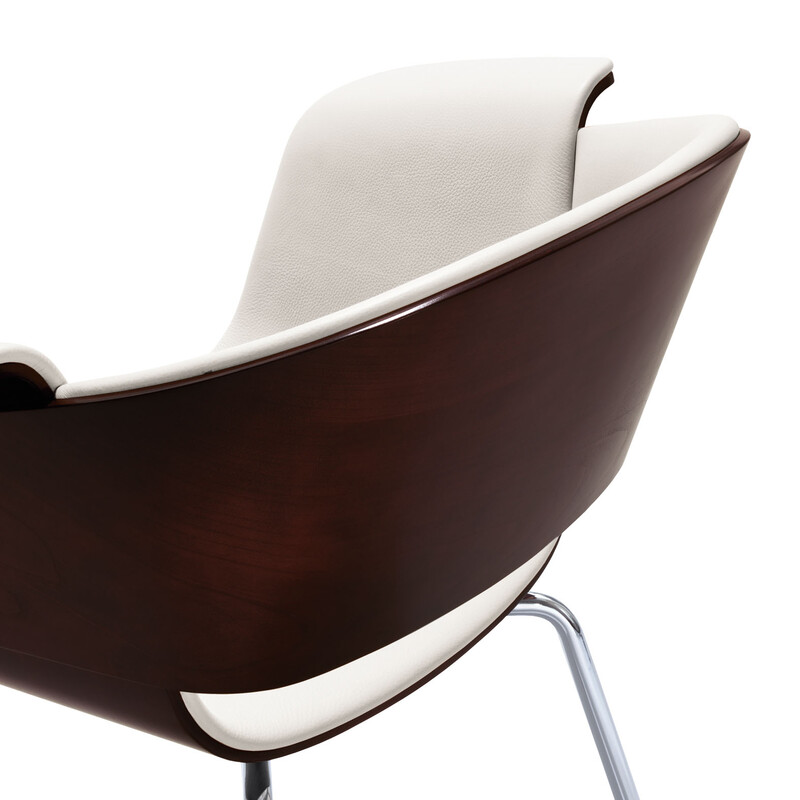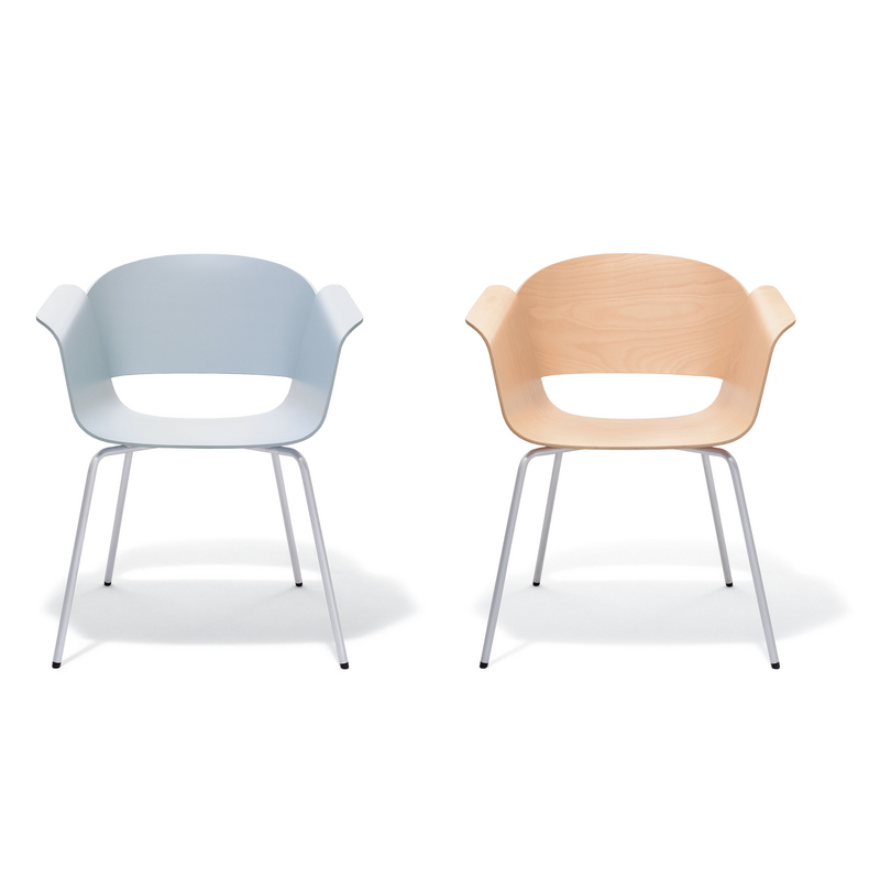 Ein Stuhl mit starker Identität. Zwei Schichtholzschalen, organisch geformt und intelligent verbunden, schaffen skulpturale Qualität. Weiche, fließende Linien als Kontrapunkt in der rationalen Welt von heute.
