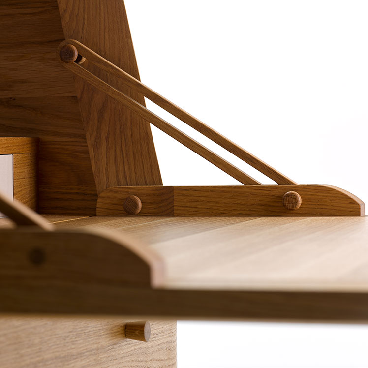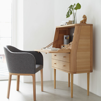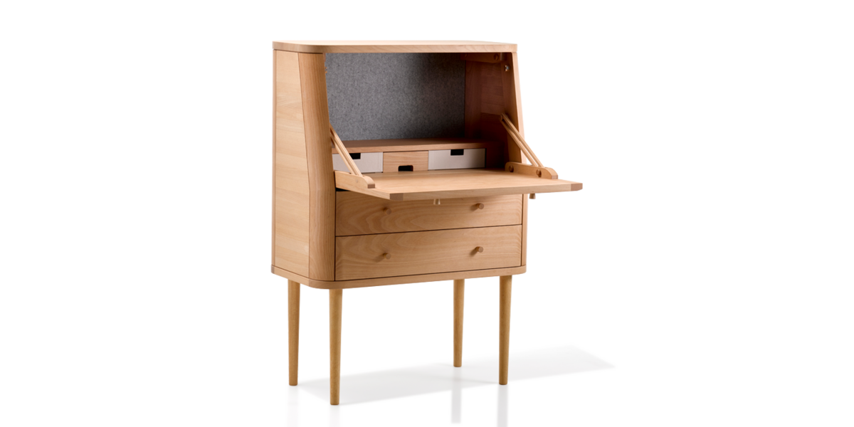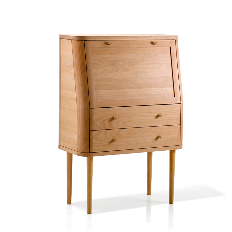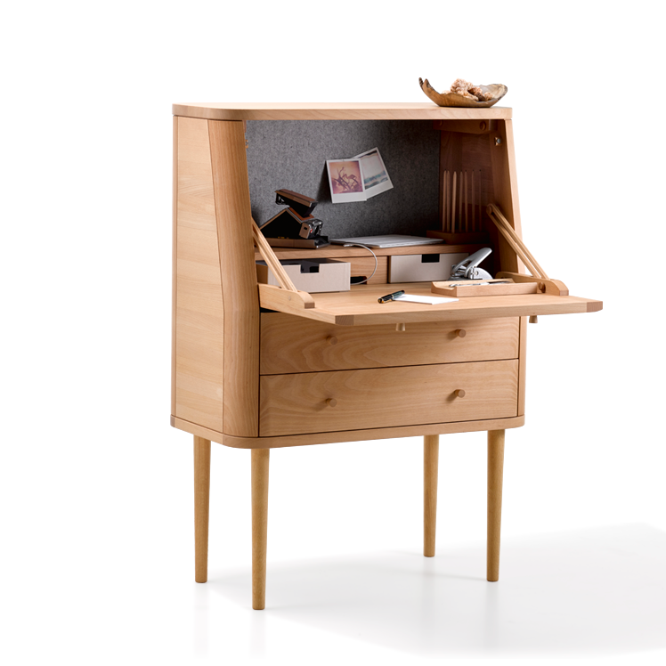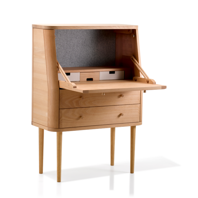 Der Sekretär Tonda ist die zeitgemäße Interpretation des klassischen, in seiner Grundform bereits seit Ende des 18. Jahrhundert gebräuchlichen Sekretärs: ein hochformatiger Schreibschrank, unten mit großen, geräumigen Schubladen, oben mit einer Klappe, die geöffnet als Schreibplatte dient – in ergonomisch angenehmer Höhe (72 cm). Geschlossen verbirgt die Klappe, was nicht für jedermanns Blick gedacht ist.