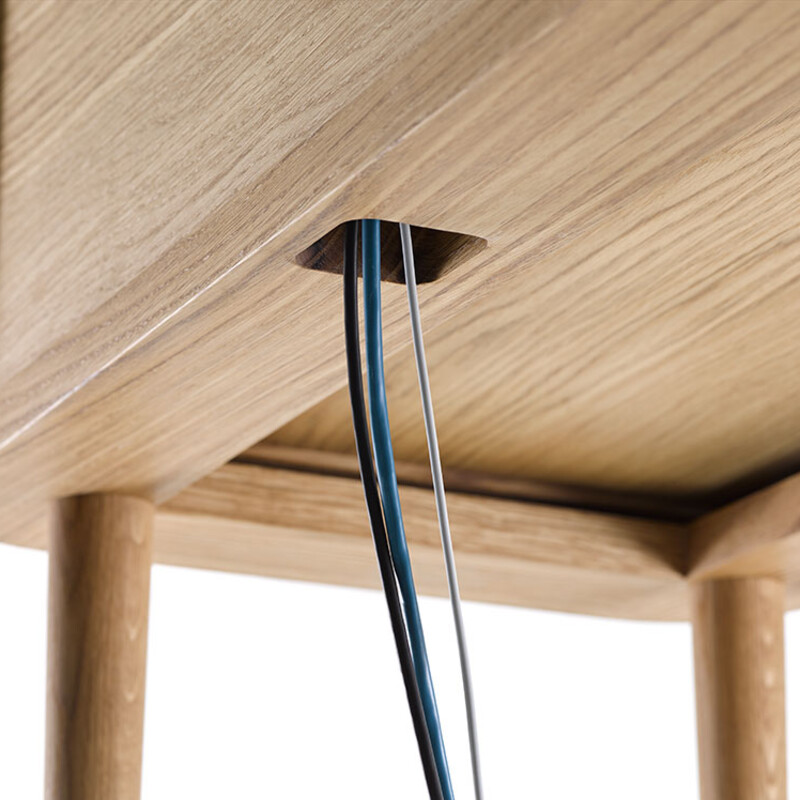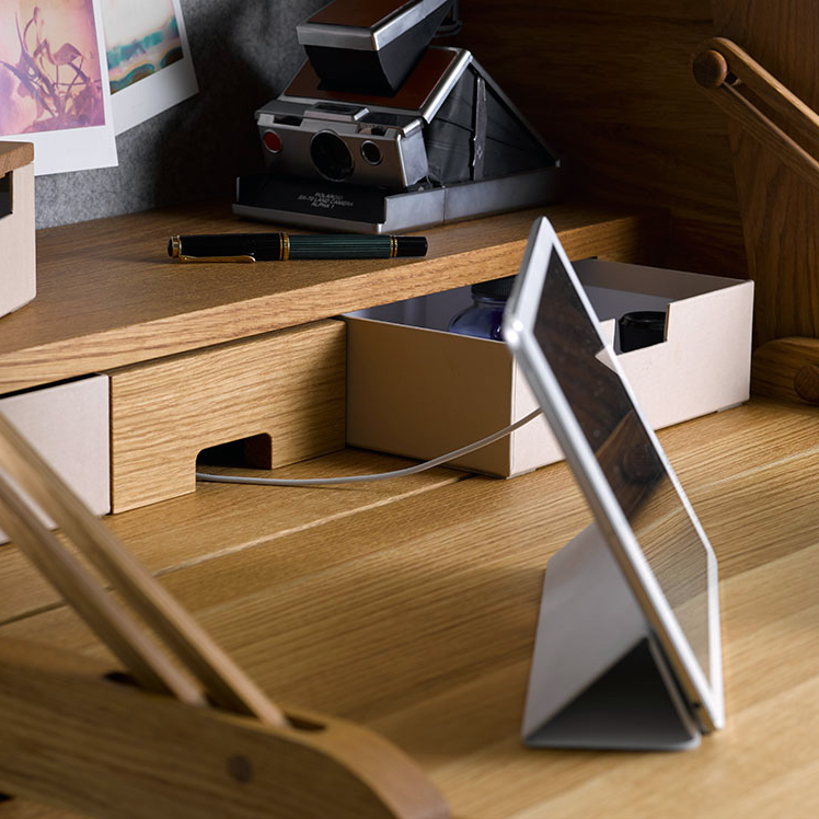 Tonda bietet raffinierte Funktionen, die man von einem modernen Home Office Möbel erwartet: Pinnwand aus Filz innen an der Rückwand, Fachbrett zum Abstellen von ordnenden Elementen (Schachteln, Stifthalter ...), Ausnehmung für Kabel.