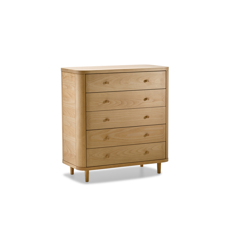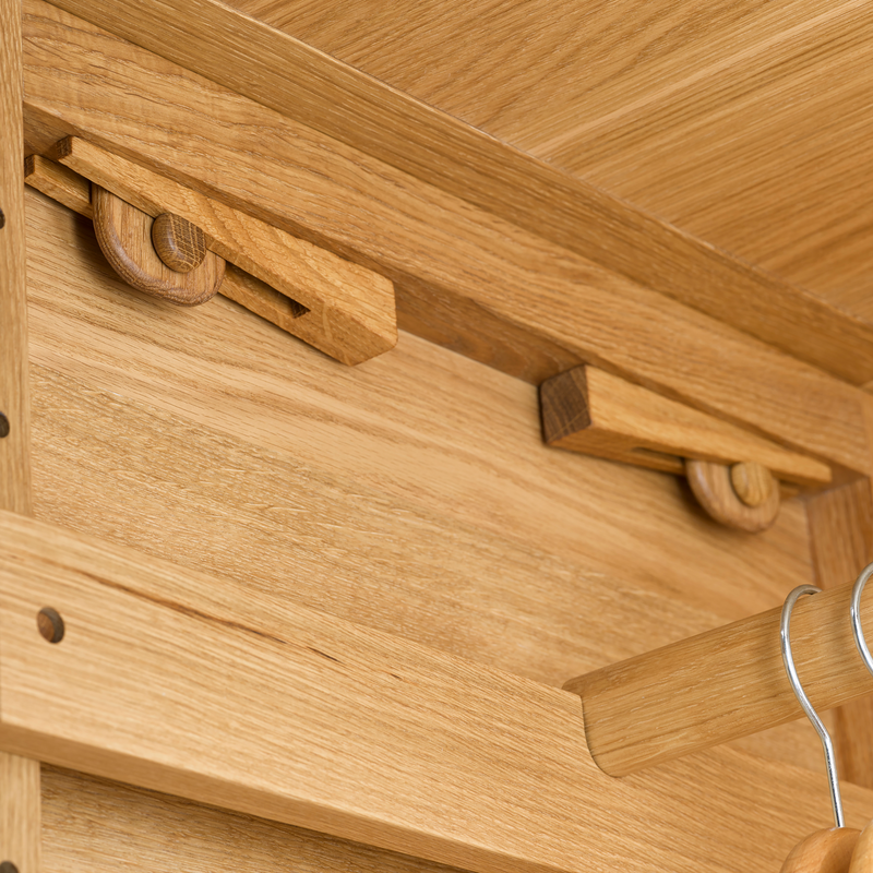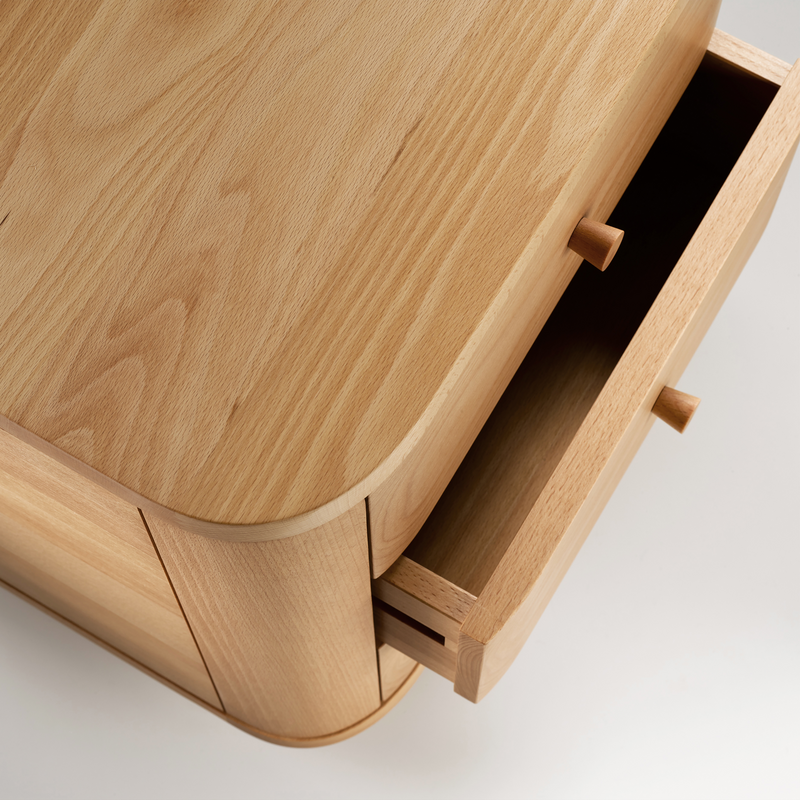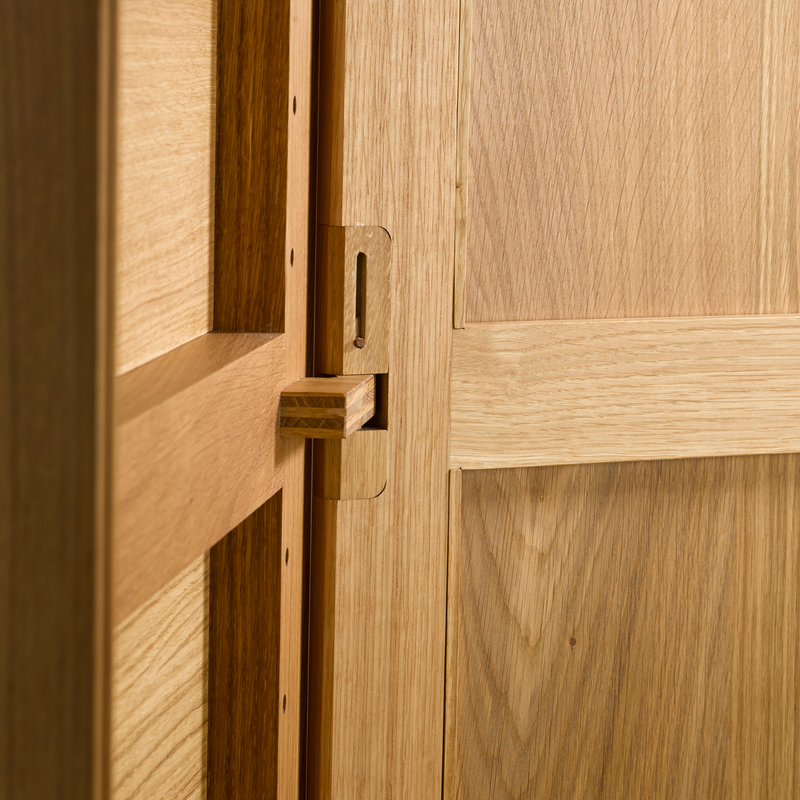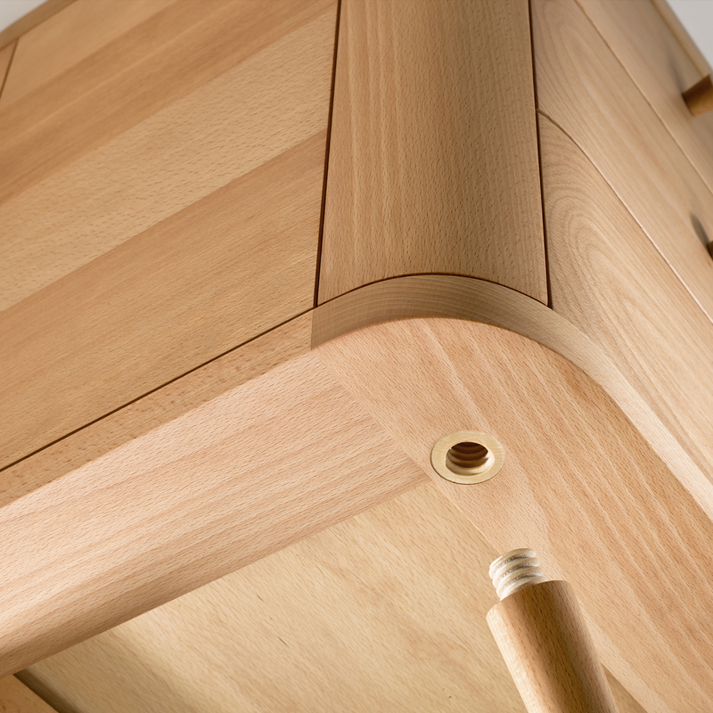 Für Tonda verarbeiten die Tischler von Grüne Erde hochqualitative Buche oder Eiche aus mitteleuropäischen Wäldern. Die Schrankkorpusse sind in traditioneller Rahmen-und-Füllung-Bauweise per Schlitz-und-Zapfen-Verbindung solide verleimt (metallfrei). Dabei werden Rahmen aus Vollholz mit Füllungen aus verwindungsfreiem Schichtholz kombiniert. Diese Konstruktion bewahrt die großen Holzflächen vor dem Verwinden. Die Oberfläche ist von Hand mit duftendem, pflanzlichem Pflegeöl eingelassen (paraffinfrei).