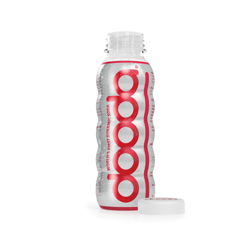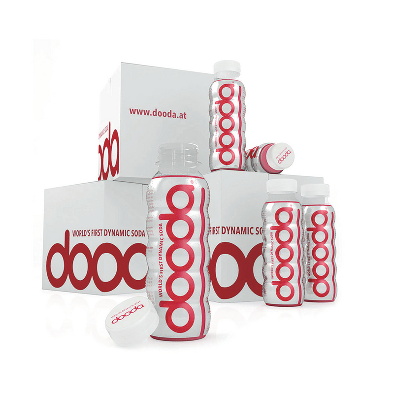 Doda bezeichnet sich als „Dynamic Soda“. Funktion, Geschmack und Natürlichkeit stehen dabei im Vordergrund. Diese Dynamik und Kraft war auch Ausgangspunkt und Inspiration der Gestaltung. Entstanden ist eine Form mit einer eigenständigen Silhouette. Die konvexen Flächen gehen einher mit dem Schriftbild des Logos.