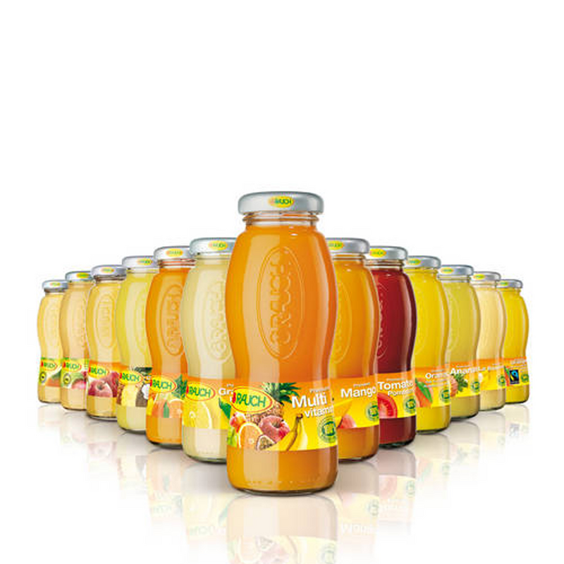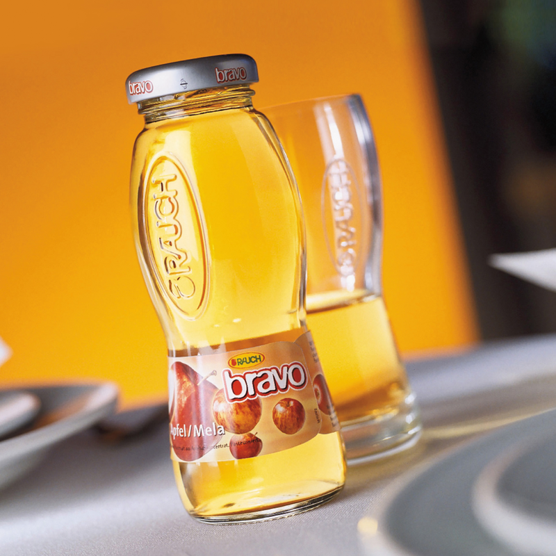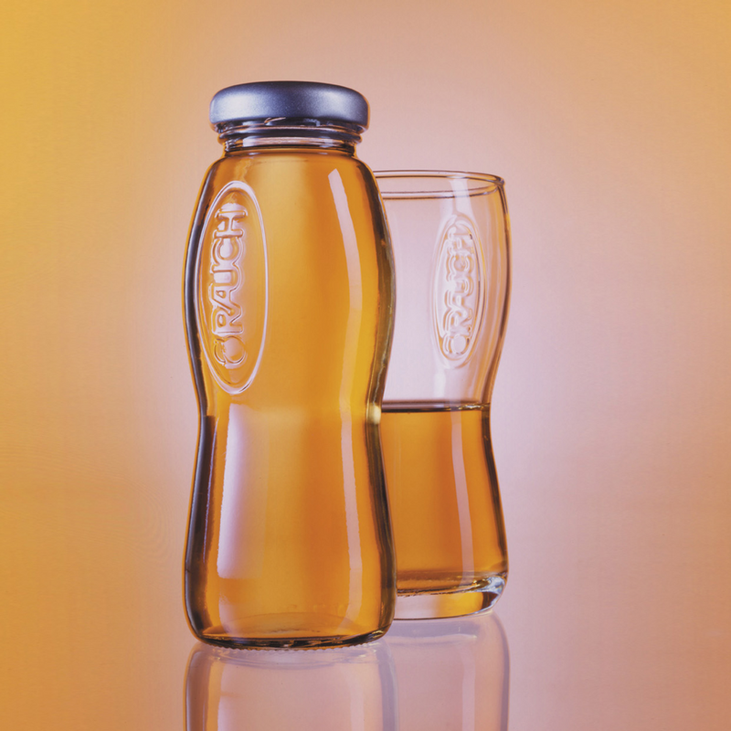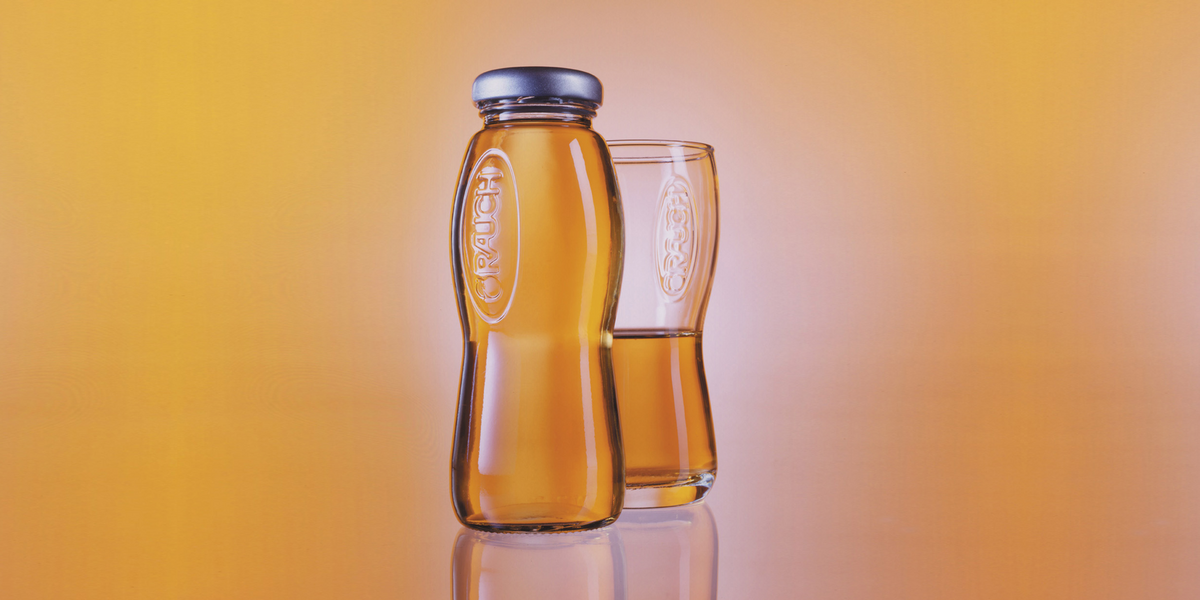 Lust auf Frucht – diese Botschaft sollen die Fruchtsaftflaschen von Rauch transportieren. Der fruchtige Aspekt rückte somit in den Mittelpunkt der Flaschengestaltung: Das transparente Glas sorgt dafür, dass die 18 verschiedenen Fruchtsaftfarben unverfälscht zur Geltung kommen. Die Position des Etiketts unterhalb der Taillierung unterstützt den „appetite appeal“ des Produkts, indem sie der Farbwirkung im oberen Bereich der Flasche genug Raum zur Entfaltung lässt.