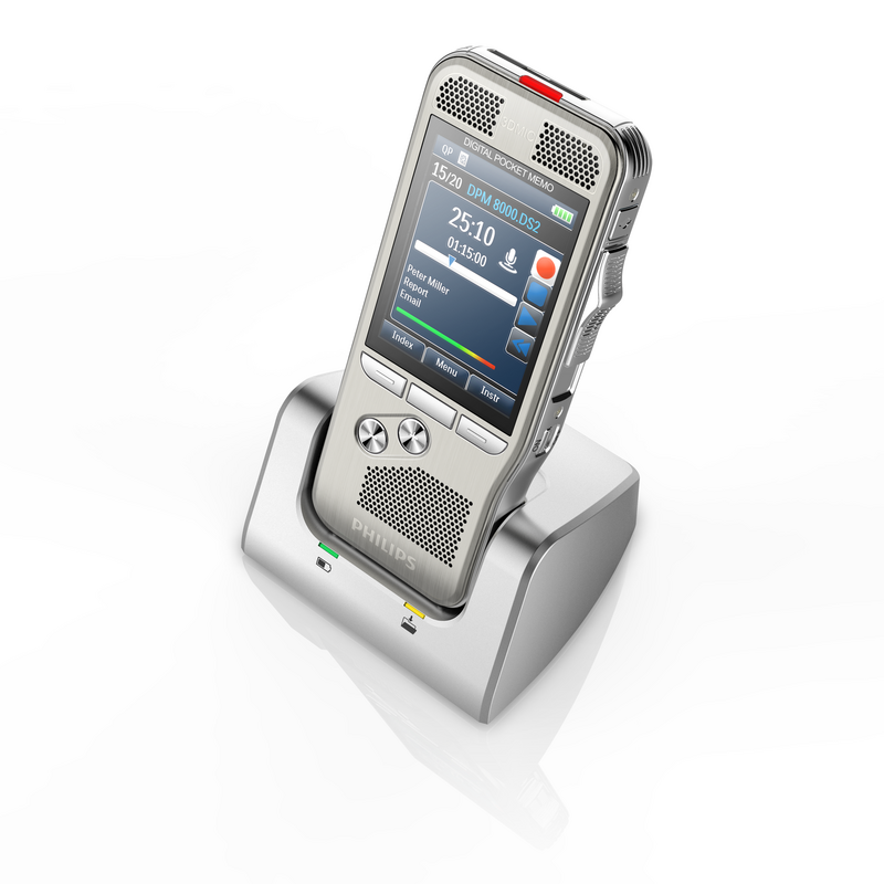 Die Asymmetrie folgt einer intensiven ergonomischen Betrachtung und charakterisiert alle professionellen Diktiergeräte von Philips. Ergänzt wird das Gerät durch eine Docking Station.