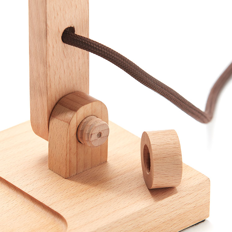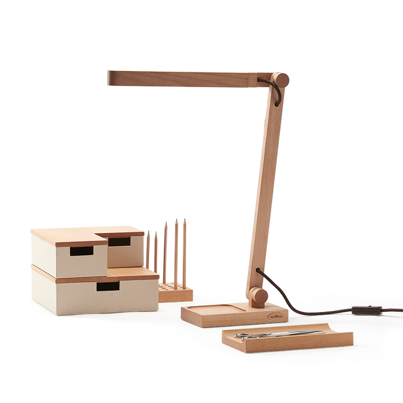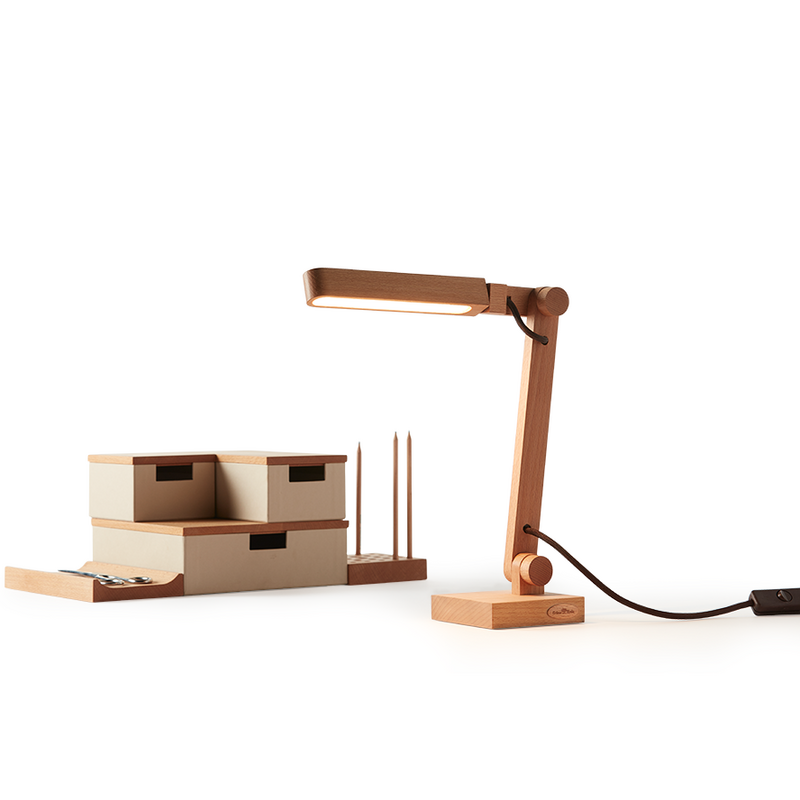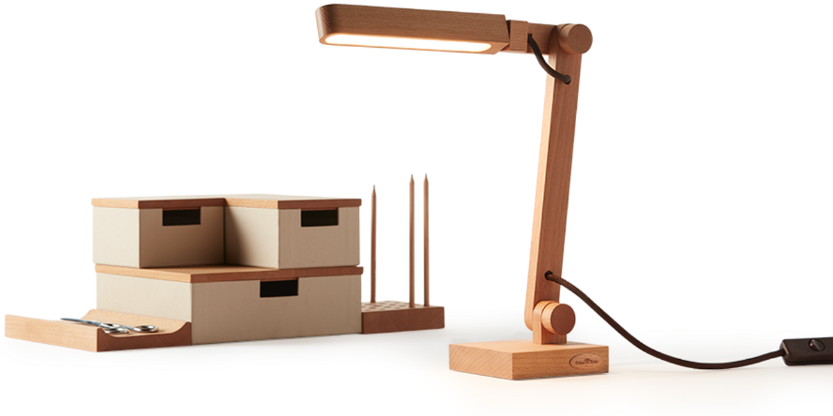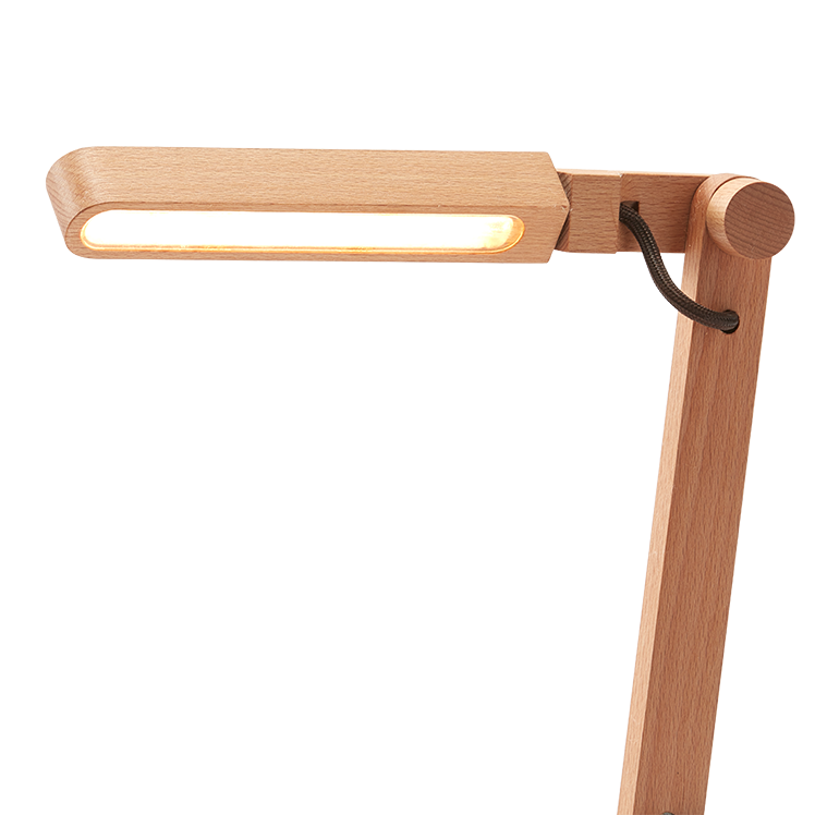 Sie ist verblüffend einfach und wirkt wie die spielerische Komposition einzelner Holz-Bausteine. Eine schlichte, klare Leuchte mit hohem Gebrauchswert, gestaltet und umgesetzt in der Grüne Erde-typischen Formensprache: schnörkellos, zeitlos, funktional und flexibel – wie man es von einer guten Tischleuchte erwartet. Eine Leuchte wie diese zu bauen, ist keine kleine Herausforderung. Sette besteht doch – mit Ausnahme der elektrotechnischen Bauteile – vollständig aus Holz! Sogar die Schrauben und Innengewinde zum Fixieren der beiden Arme sowie das Drehgelenk des Lichtbalkens sind aus Holz gefertigt. Die Lichttechnik ist zeitgemäß und energiesparend mit LED ausgeführt und gewährleistet eine gleichmäßige Ausleuchtung, ohne zu blenden. Der Lichtbalken ist um ca. 60° nach links und rechts schwenkbar. In den Sockel der Schreibtischleuchte ist eine Ablageschale für kleine Büroutensilien eingefräst.