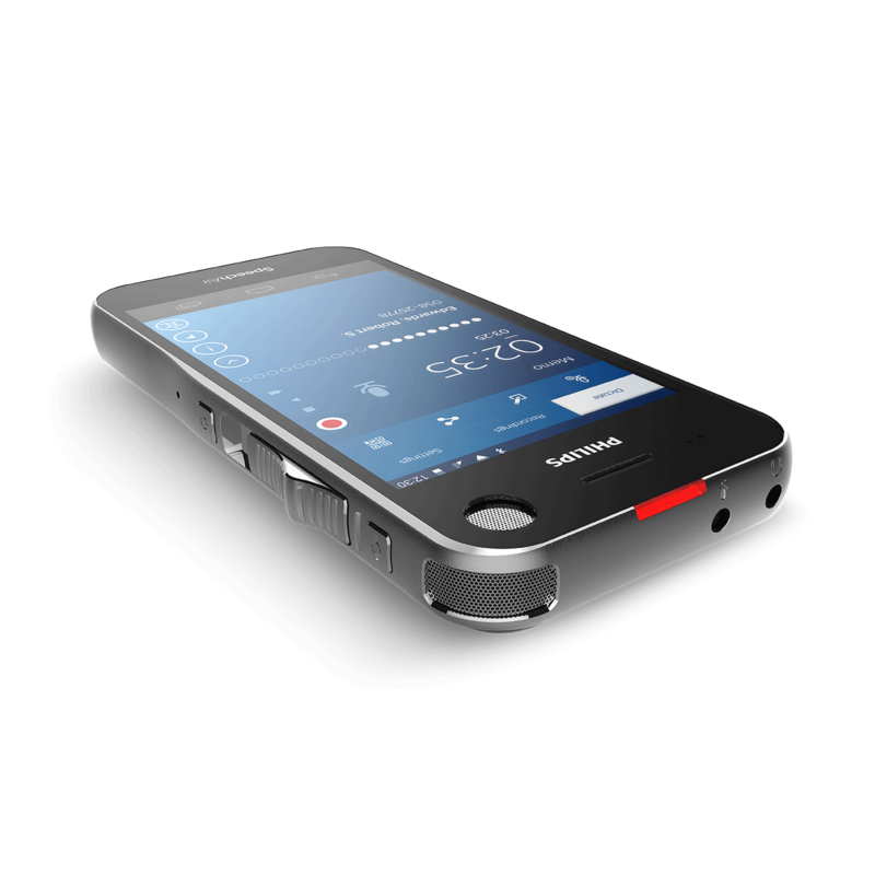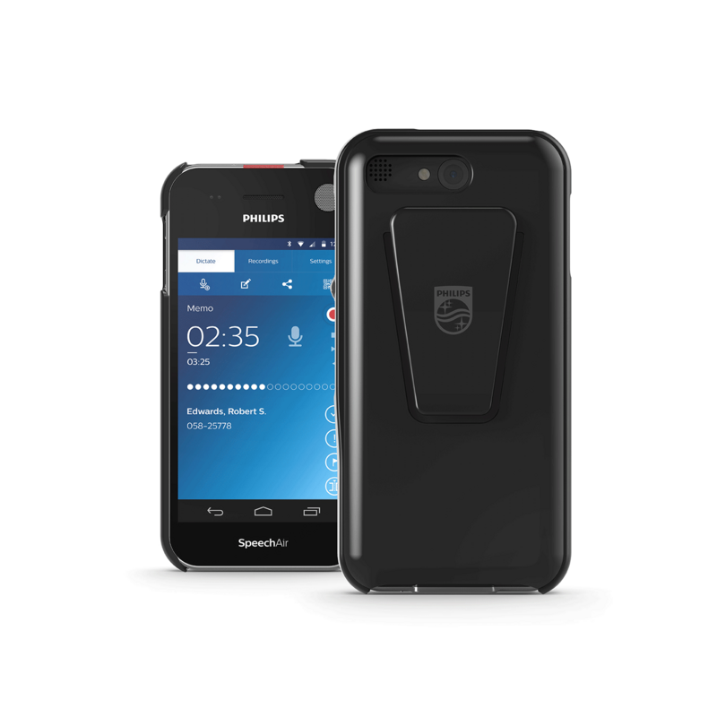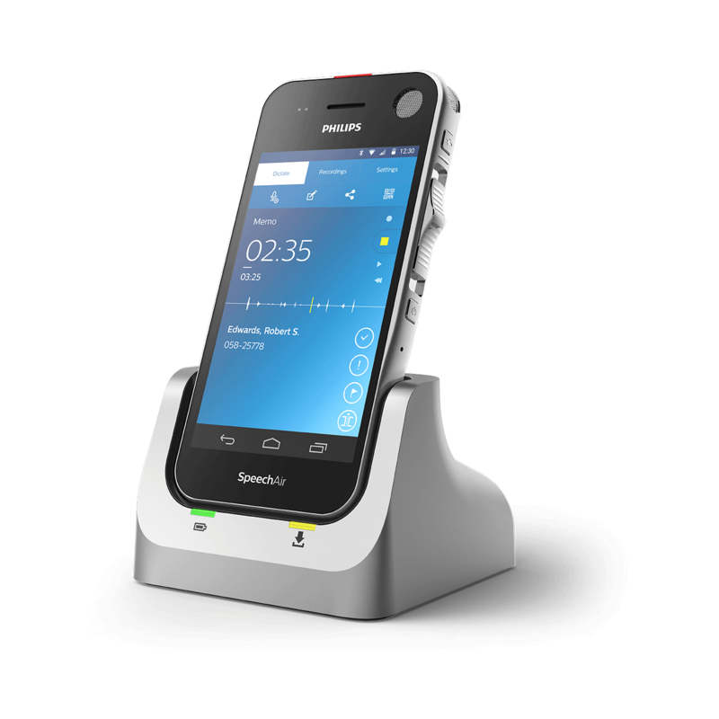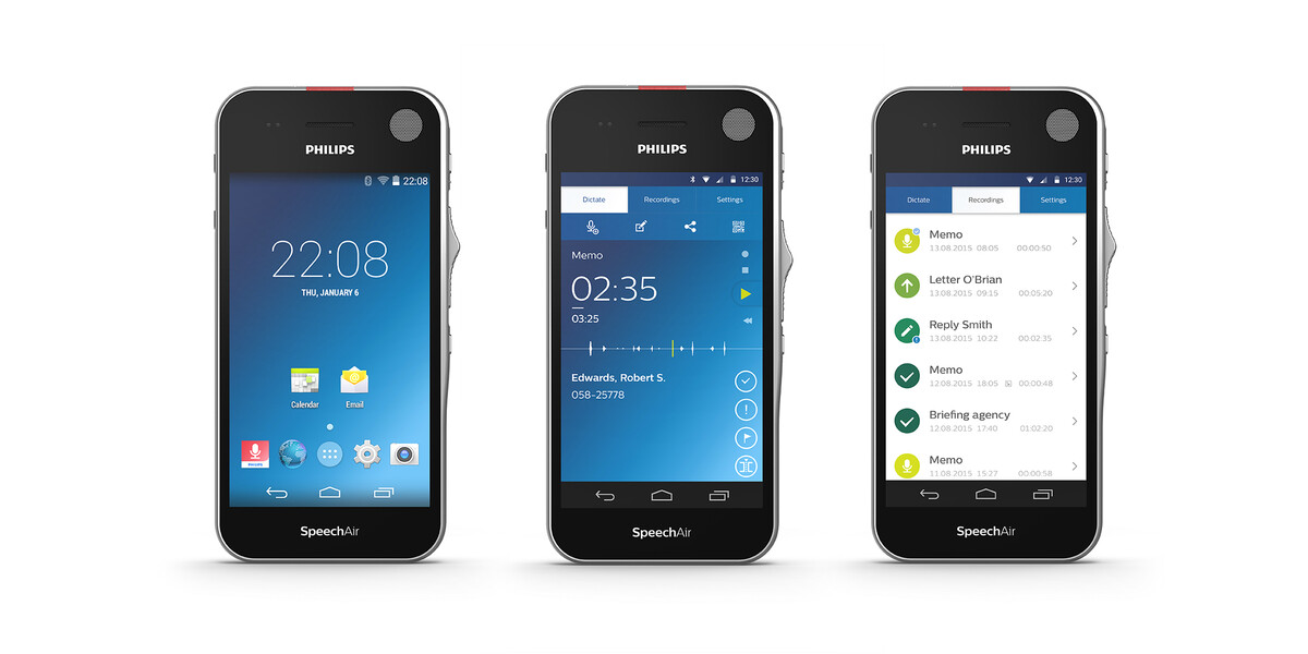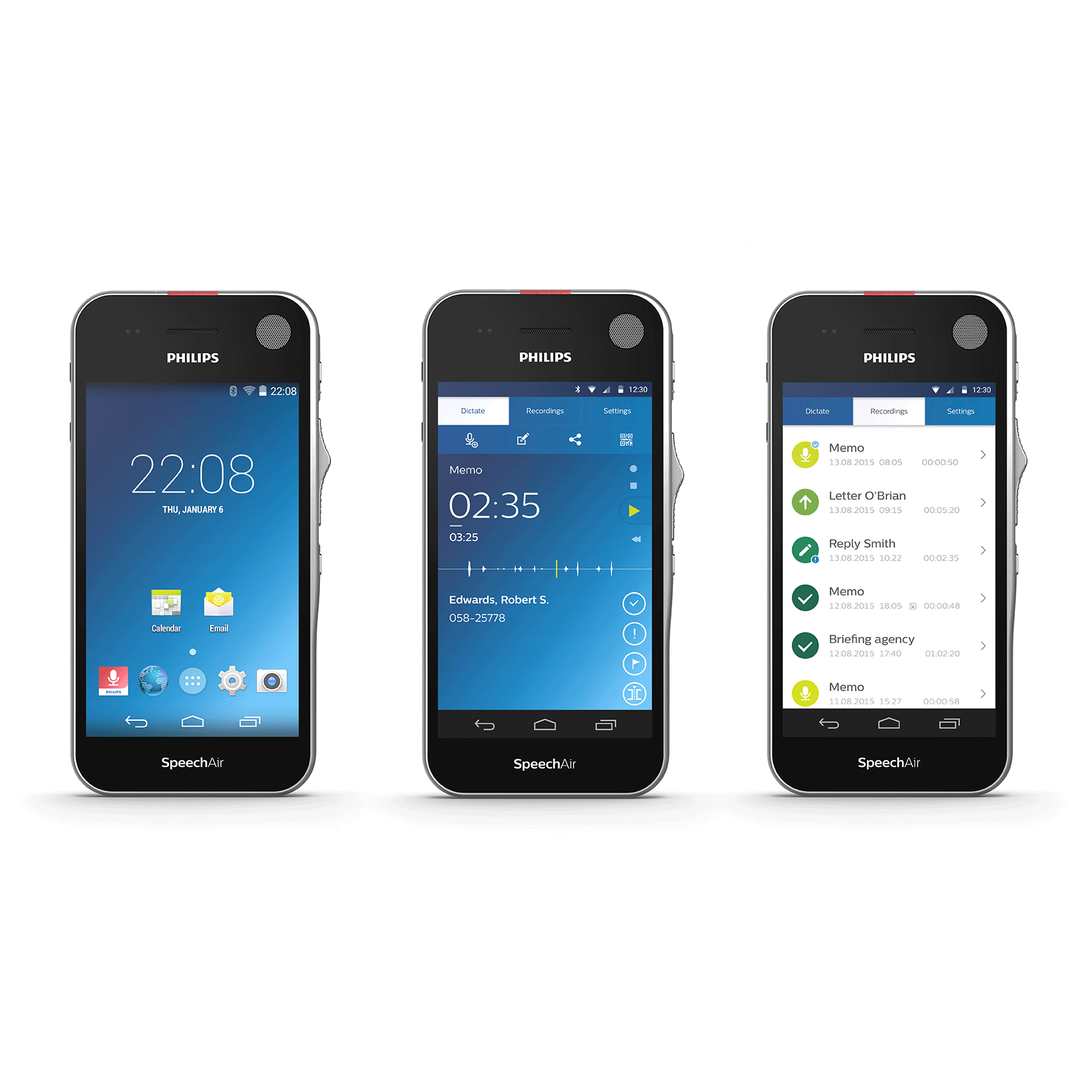 Das Speech Air von Philips ist das erste Diktiergerät mit der Funktionalität eines Smartphones. Es verfügt über einen großen Touchscreen zur Verwaltung der Memos und Telefonate. Das wesentliche Bedienelement bleibt jedoch der Philips-typische Schiebeschalter. Alle Materialien sind antimikrobiell – ein Anforderungen für den Einsatz in Krankenhäusern.